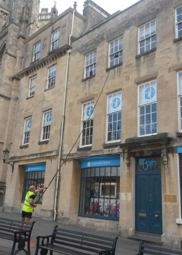 The Reach & Wash system uses high pressure de-ionised water to clean windows, cladding, conservatories and solar panels thereby causing no risk to the environment. There are absolutely no chemicals used, and together with the soft brush used to remove the dirt it is a perfect choice for cleaning the glass surfaces of Bath’s heritage buildings without causing any damage.